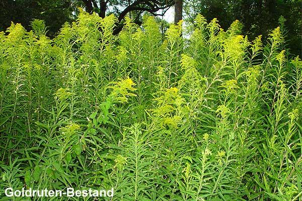Die Goldrute ist eine 0.5 bis maximal 2.5 m hoch werdende, mehrjährige, gelb blühende Staude. Sie stammt aus den USA und dem südlichen Kanada. Als Zierpflanze und Bienenweide wurde sie häufig angepflanzt. Die Goldrute ist die häufigste invasive Pflanze der Schweiz. Sie breitet sich rasch und flächendeckend aus, verdrängt andere Pflanzenarten und schädigt so die Artenvielfalt. Die Verbreitung erfolgt durch flugfähige Samen sowie durch Wurzelsprossen. Einzelne, kleine Wurzelbruchstücke können sich zu ganzen Pflanzen regenerieren. So können insbesondere Gartenabfälle auf wilden Deponien den Goldruten zur weiteren Ausbreitung verhelfen.